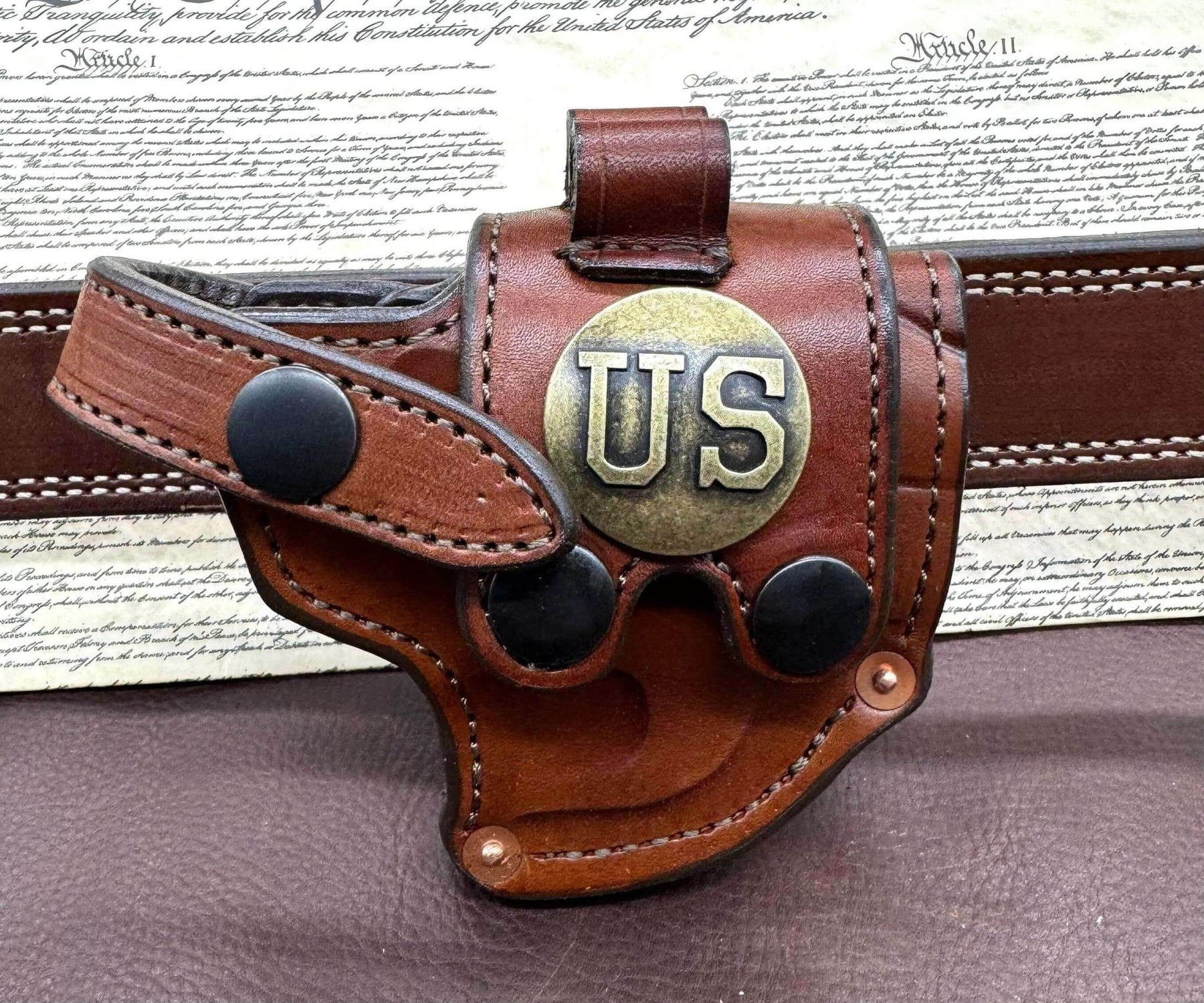 This Sidewinder holster comes w/2 ammo loops & your choice of Dark Brown w/Brown Stitching, & an Antique Silver Concho or Golden-Brown Leather w/Brown Stitching, & an Antique Brass Concho.