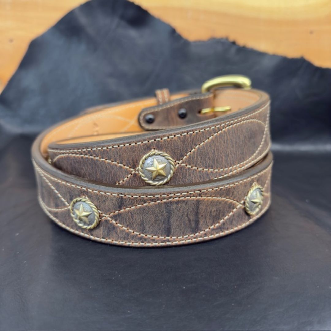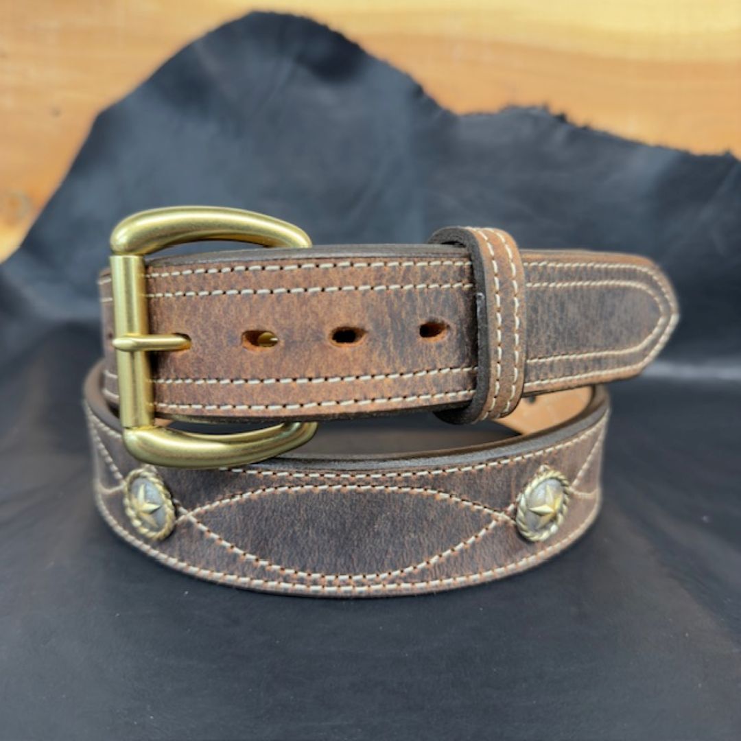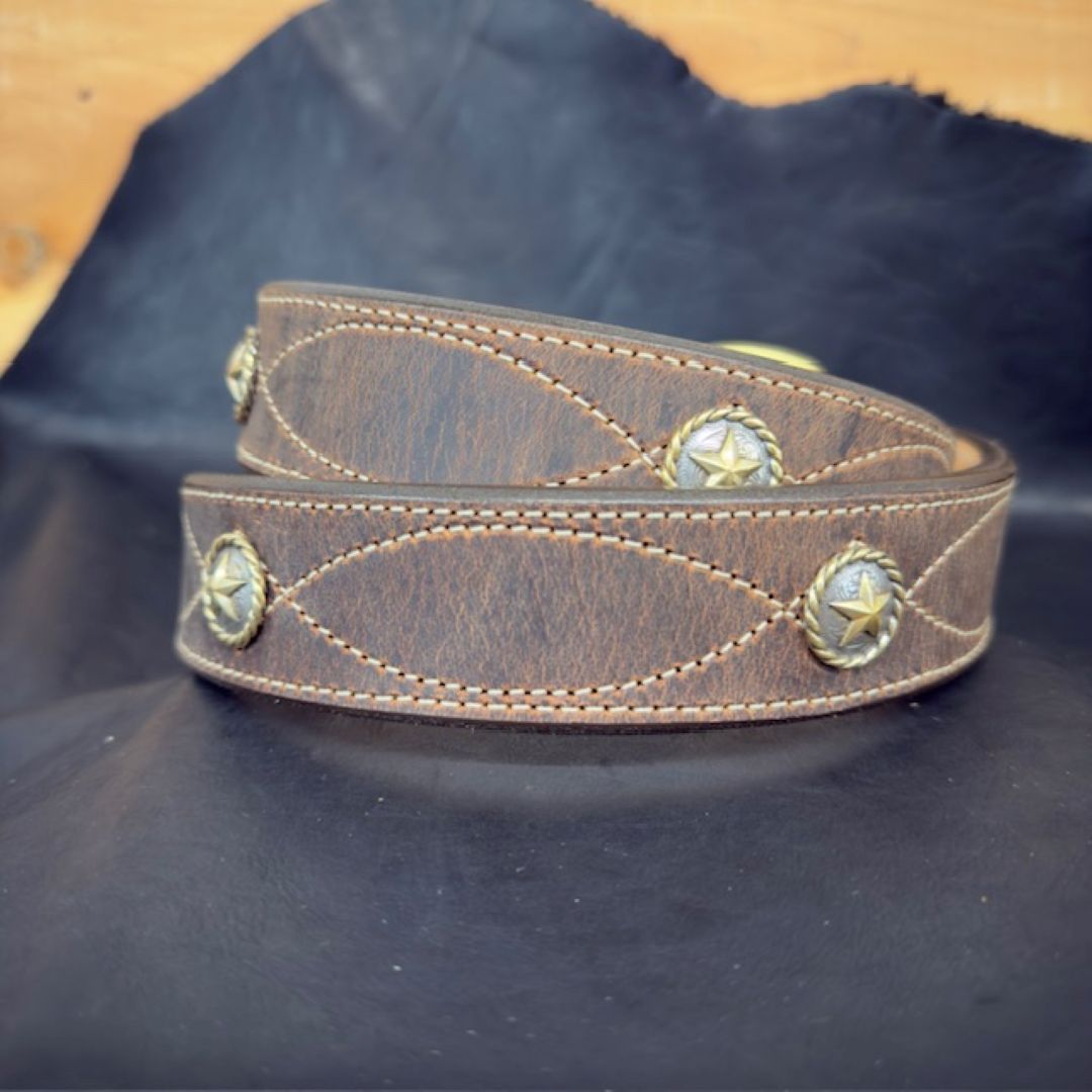 *In Stock* 1.5" Fancy Stitch Water Buffalo Carry Belt – Brass Star Conchos (Size 40)